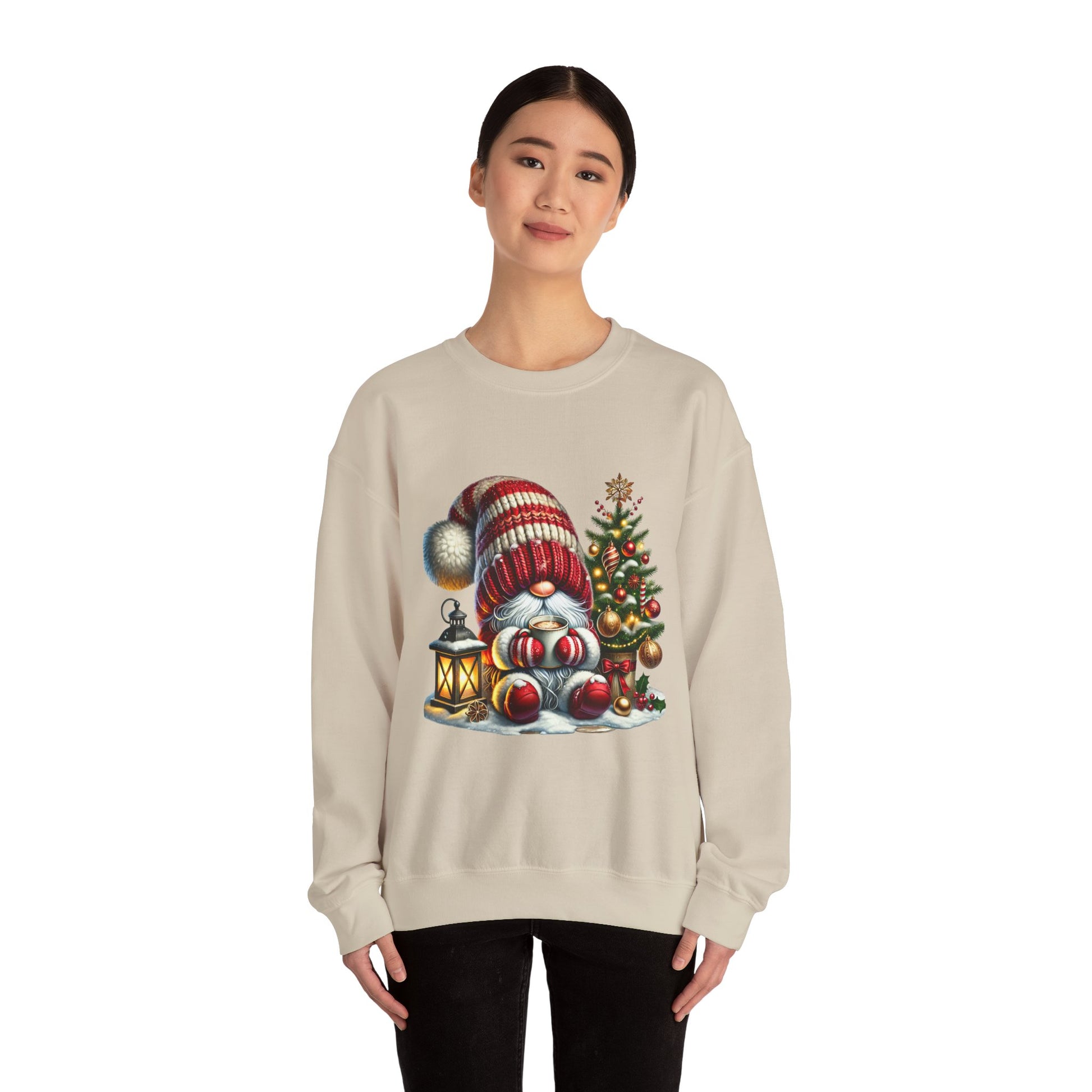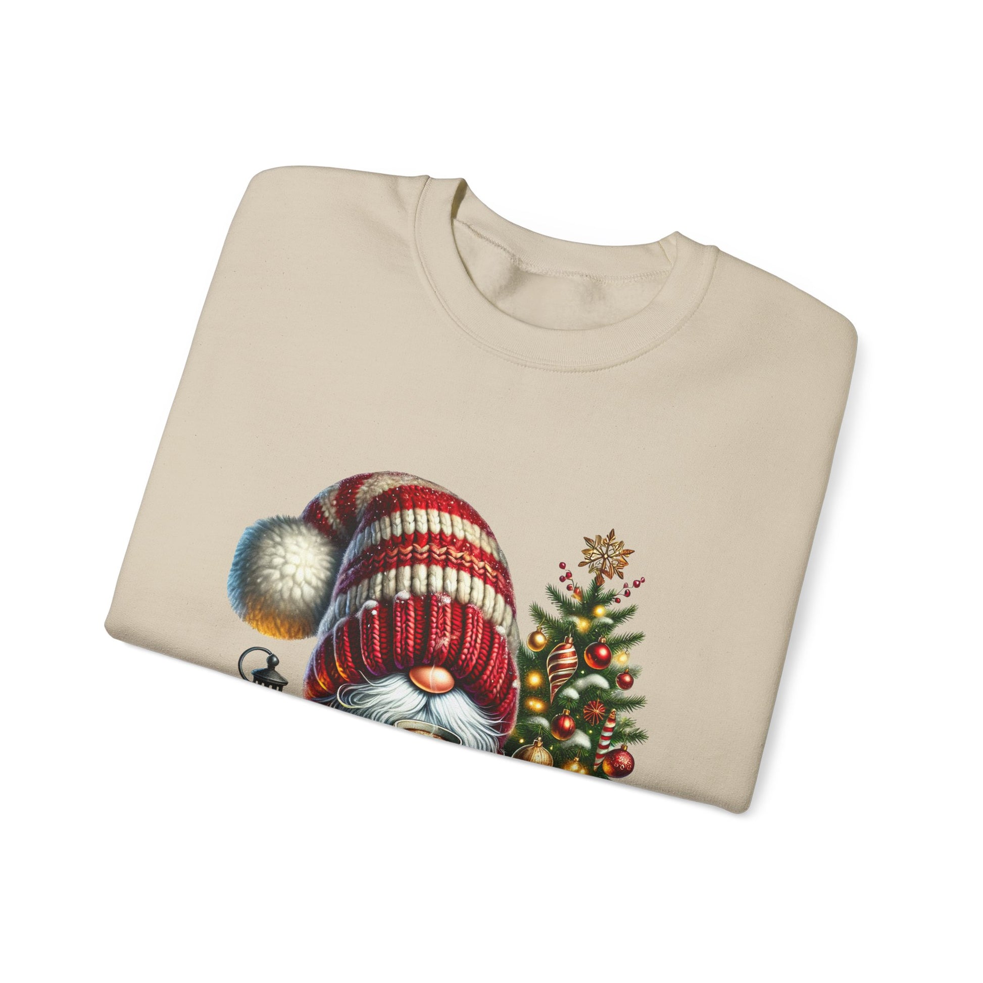 A cozy, heartwarming crewneck sweatshirt that brings a soft, whimsical holiday scene to everyday wear. The front features a charming gnome in a striped knit hat, curled beside a glowing lantern and a tiny decorated tree — details rendered in warm, painterly colors that feel hand-illustrated. The medium-heavy 50/50 cotton–polyester blend and classic fit create a comfortable layer for cool evenings at home or casual outings. Thoughtful construction — tubular knit body, ribbed collar, and double-needle stitching at stress points — keeps this sweatshirt looking fresh and wearable season after season. Subtle, quality-focused touches like OEKO-TEX certified dyes, a tear-away label, and embroidery placement options make it an honest, well-made piece to reach for when you want both comfort and charm.